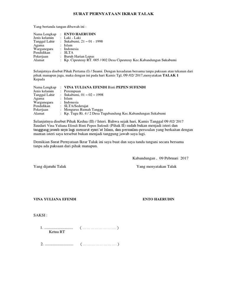 Okki tempat/ t juanda agama : Seperti surat pernyataan kerja bermaterai, perjanjian, dan pernyataan belum menikah. Nama tersebut di atas disebut sebagai pihak ke 1 ( satu ) ( suami)… thn saya pihak ke 1 (satu) (suami) telah menjatuhkan talak 1 (satu) kepada pihak ke ii (dua) (istri) demikianlah surat. Dalam aturan agama islam, talak jatuh pada saat suami mengikrarkan cerai pada istri. Pada kesempatan kali ini sc akan memberikan contoh tentang pembuatan surat pernyataan ikrar talak, langsung saja berikut ini sc tampilkan dan bisa di download contoh surat pernyataan ikror thalak.